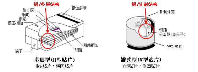 2. “罐式”型(V型貼片):這種類型的電容器采用了軋制鋁材結(jié)構(gòu)作為陽(yáng)極,同樣使用固體導(dǎo)電高分子作為陰極。與H型貼片相比,V型貼片的結(jié)構(gòu)更為簡(jiǎn)單,通常具有較大的容量和較高的電壓承受能力。然而,由于其體積較大,不太適合用于對(duì)空間要求較高的場(chǎng)合。